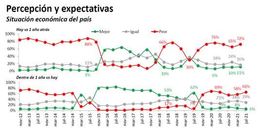 Argentina, 5 de agosto de 2021. – El último relevamiento realizado por CREA el pasado mes de julio refleja que el 66% de los 1119 empresarios agropecuarios consultados cree que la situación del país estará peor dentro de un año, una proporción ocho puntos superior al nivel registrado en marzo pasado.