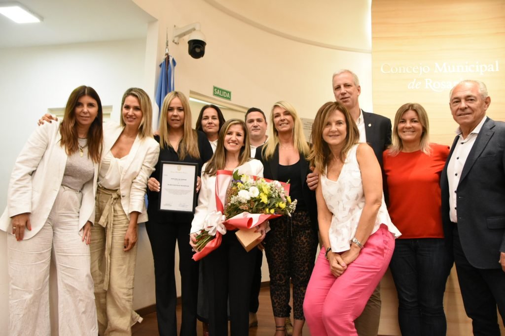 Tras la entrega por parte de María Soledad Aramendi de libros sobre los 125 años de la Rural rosarina a la presidenta del Concejo, Schmuck y a la concejala León, se leyó el decreto por el que se entrega el Diploma de Honor “por su dedicación y perseverancia que la llevaron a ocupar el máximo cargo en la institución, lugar que históricamente estuvo ocupado por varones y que pone de manifiesto el avance en el camino a la igualdad entre mujeres y varones”.